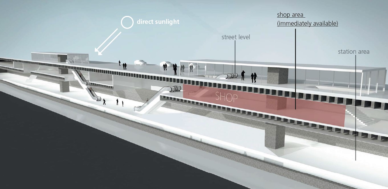 - A concept for the reactivation/conversion of the underground train station into retail plaza.